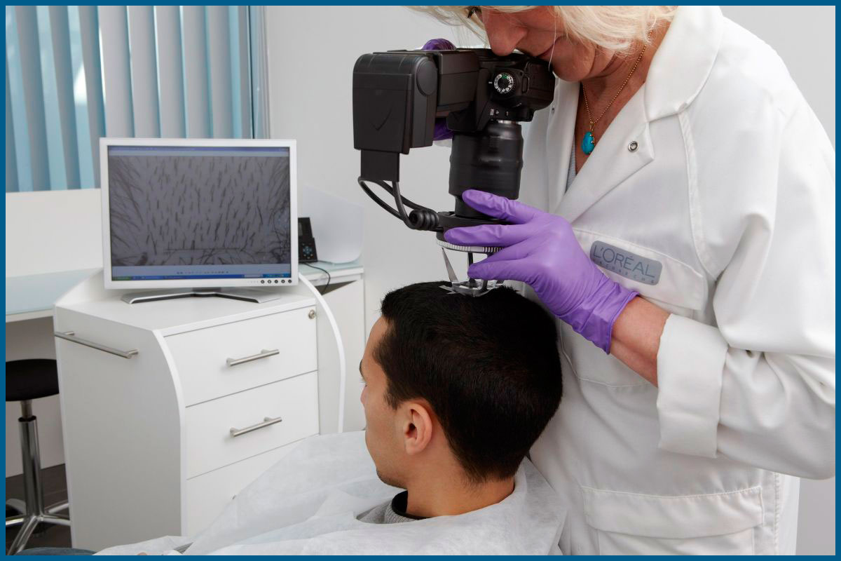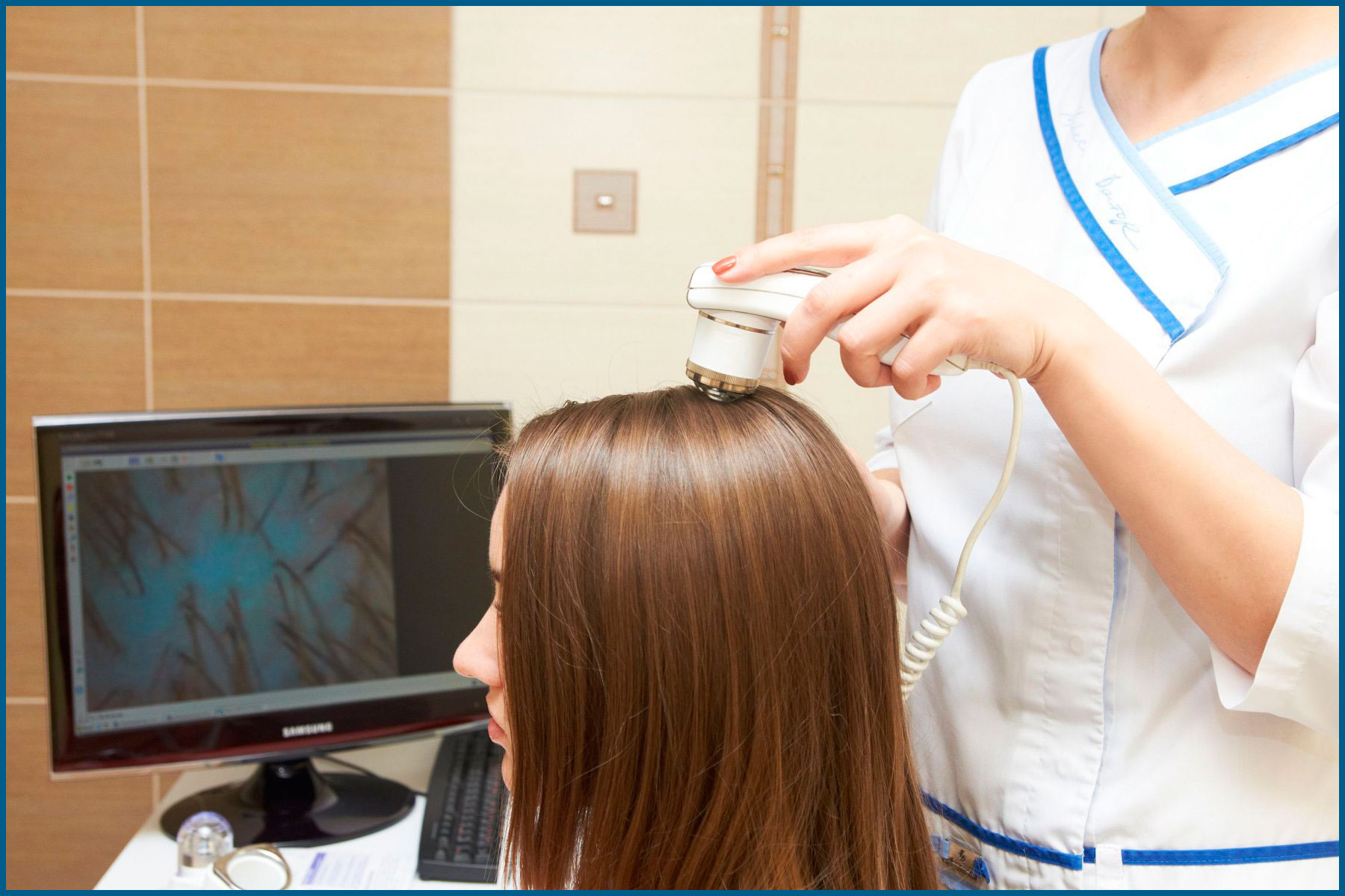 - Сбор информации по состоянию кожи головы, волос. Так врач может прогнозировать дальнейшее развитие облысения, а также наметить участки, откуда можно использовать донорский материал;