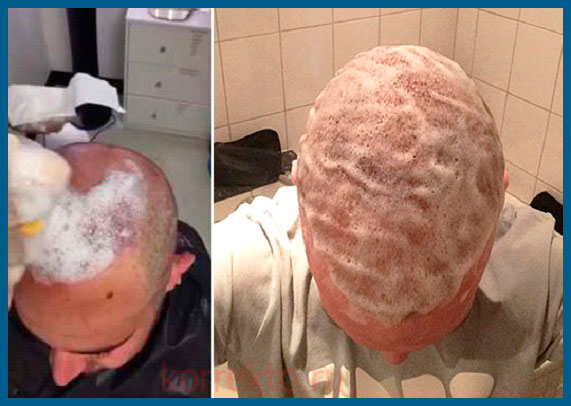 - шампунь вспенивается и кожа промакивается им и после нанесения нужно все смыть. Исключить необходимо прямое падение мощной струи воды на место пересадки, лучше пользоваться рассеивающим душем и не включать сильный напор.