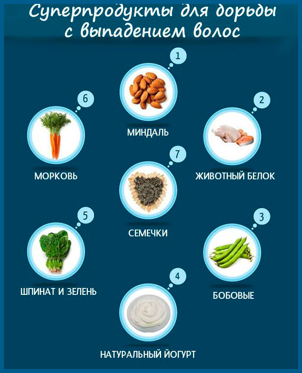 - Сбалансированное питание. Существуют десятки микроэлементов, влияющих на какой-либо аспект состояния волоса. Цинк, сера, железо, фосфор, кальций, магний, йод, а также витамины нескольких групп – все это должно присутствовать в пище. Обычно, человек, употребляющий сбалансированно животное мясо, морепродукты, овощи, фрукты и витаминные комплексы, получает все необходимое;